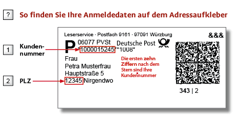 Ihre Kundennummer finden Sie auf dem Adressaufkleber Ihrer Zeitschrift. Bitte verwenden Sie die dort angegebene Kundennummer und Postleitzahl.