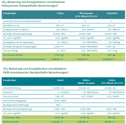 Auf der UBA-Website findet man auch für den ersten Einstieg einen Online-Rechner. Dieser ist nicht schlecht gemacht, steht aber vor dem Dilemma, einfach bedienbar sein zu müssen, aber nicht zu viel zu pauschalisieren. Zielführender ist es, m Unterricht die Auszubildenden selbst dazu zu befähigen, die Berechnungen durchzuführen. Besonders gut gelingt dieses in den Bereichen Wohnen, elektrische Energieversorgung und Mobilität. Dort besteht ein einfacher Zusammenhang zwischen Energiebedarf, der Art des Energieträgers und der daraus resultierenden CO2-Belastung. Parallel lassen sich aber auch die Energiebereitstellungskosten, die oft bei den Lernenden für Erstaunen sorgen und einen guten Einstieg in eine weiterführende Diskussion ermöglichen.