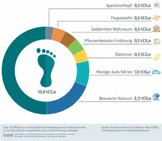 Der Ökologische Fußabdruck im Allgemeinen versucht, den durch den Lebensstil und die Aktivitäten einer Person oder eines Unternehmens verursachten Ressourcenverbrauch anschaulich zu machen. Dabei gibt es verschiedene Definitionen. Gut im Unterricht bzw. der Ausbildung einsetzbar ist der Ökologische Fußabdruck nach dem Verständnis des Umweltbundesamtes (UBA), der die Jahresmenge der treibhauswirksamen Gase von einzelnen Verbraucher* innen in Tonnen CO2-Äquivalent angibt. Dieses Maß ist einfach zu berechnen und sehr konkret zu beeinflussen. Für einen ersten Einstieg findet man auf den Internetseiten des UBA eine gute Veranschaulichung und einen Online-Rechner. Gut ist, dass das UBA vermeidet, den Zeigefinger zu erheben, sondern aufzeigt, wie jede*r Einzelne mit relativ einfachen Mitteln 2030-ready werden könnte, also welche sog. Big Points es gibt, um den persönlichen Fußabdruck zu halbieren, was eine wichtige Zwischenetappe bis 2030 sein muss.