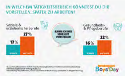 Der Anteil der Boys’Day-Teilnehmer, die sich sehr gut vorstellen können, in den Gesundheits- und Pflegeberufen zu arbeiten, steigt nach der Teilnahme am Boys’Day von 16 auf 22 Prozent. In den erzieherischen und sozialen Berufen steigt dieser sogar von 17 auf 27 Prozent. Der Boys’Day ist somit ein wichtiger Baustein in der Beruflichen Orientierung. Er unterstützt dabei, das Berufs- und Studienwahlspektrum der Jungen zu erweitern.