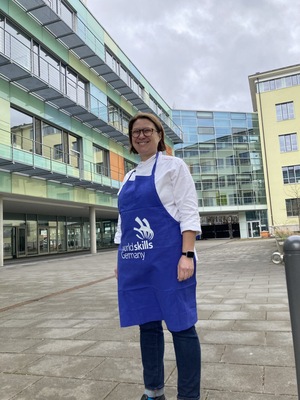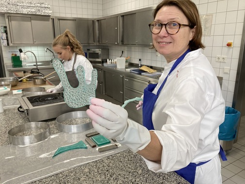Eine Woche vor der Lizenzierung nahm WorldSkills-Bundestrainerin und Berufsschullehrerin Sabine Baumgarten beim ersten Präsenzworkshop in der Städtischen Berufsschule für das Bäcker- und Konditorenhandwerk das Training für die WorldSkills 2024 in Lyon auf. Aktuell trainiert Baumgarten mit drei Teilnehmerinnen die Anfertigung von Schokolade- und Zuckerschaustücken und strahlt dabei über das ganze Gesicht. Seit vielen Jahren leitet sie in der Disziplin „Konditor*in“ die Vorbereitungen auf die Weltmeisterschaften der Berufe und ist als Bundestrainerin auch Jurymitglied bei den WorldSkills.