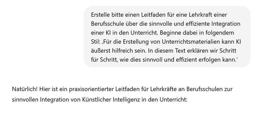 „Erstelle bitte einen Leitfaden für eine Lehrkraft einer Berufsschule über die sinnvolle und effiziente Integration einer KI in den Unterricht. Beginne dabei in folgendem Stil: ‚Für die Erstellung von Unterrichtsmaterialien kann KI äußerst hilfreich sein. In diesem Text erklären wir Schritt für Schritt, wie dies sinnvoll und effizient erfolgen kann.‘“