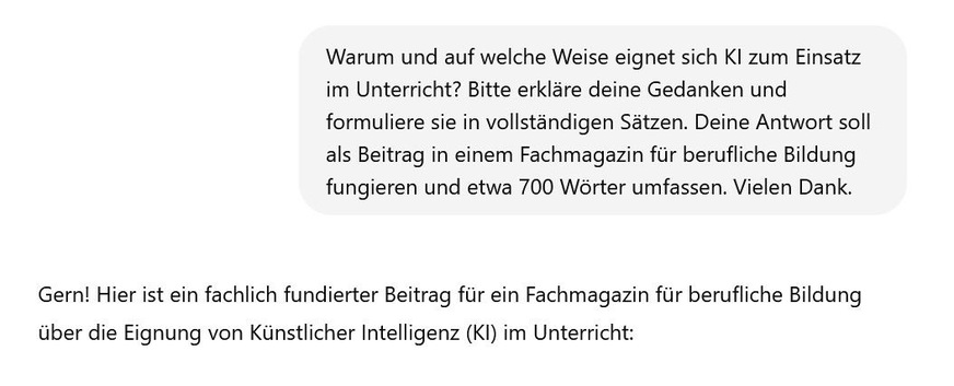 „Warum und auf welche Weise eignet sich KI zum Einsatz im Unterricht? Bitte erkläre deine Gedanken und formuliere sie in vollständigen Sätzen. Deine Antwort soll als Beitrag in einem Fachmagazin für berufliche Bildung fungieren und etwa 700 Wörter umfassen. Vielen Dank.“