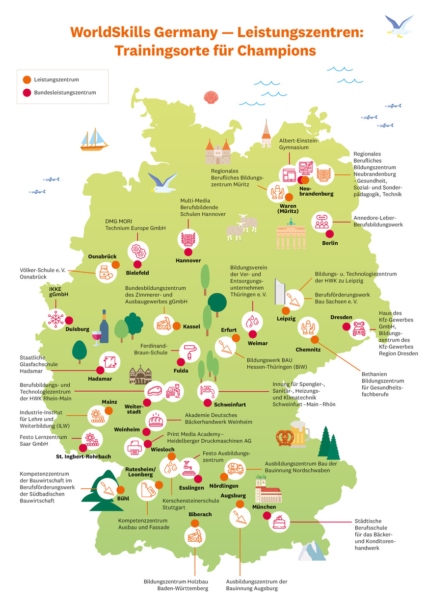 30 Einrichtungen, die berufliche Ausbildung und Wettbewerbstraining systematisch miteinander verbinden und so die Qualität und Sichtbarkeit beruflicher Bildung stärken.